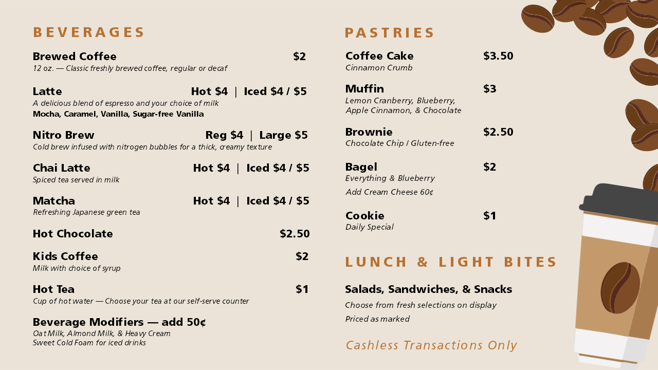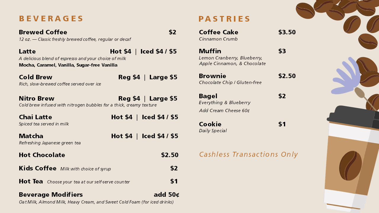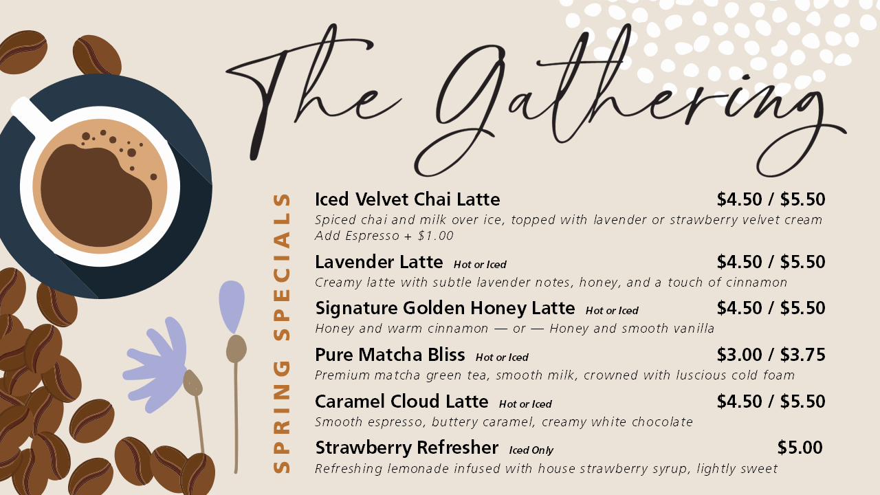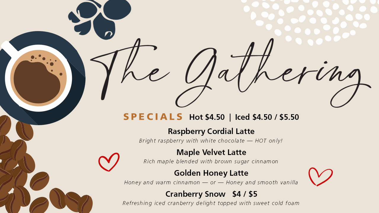 Stop by The Gathering at Calvary Church for delicious brewed coffee, specialty beverages, and small bites!